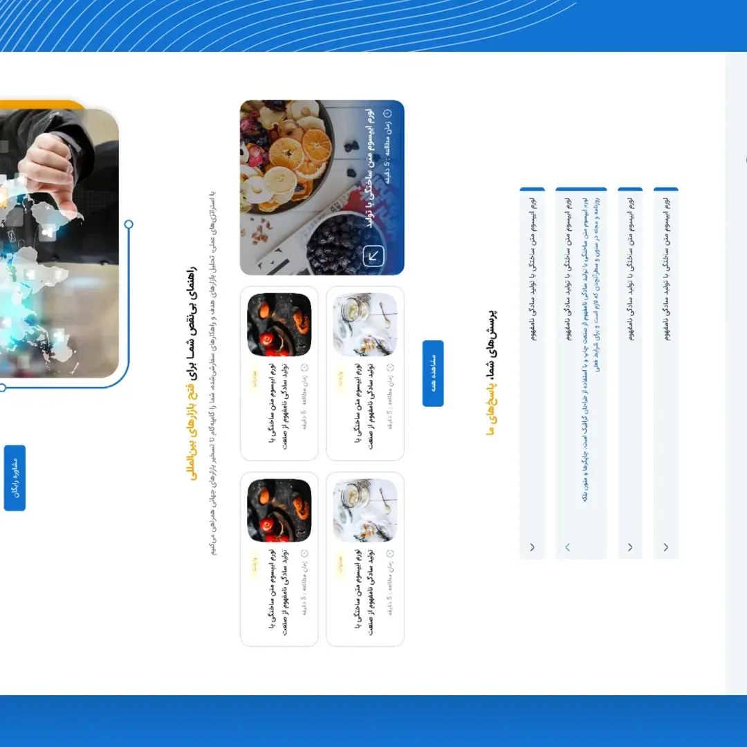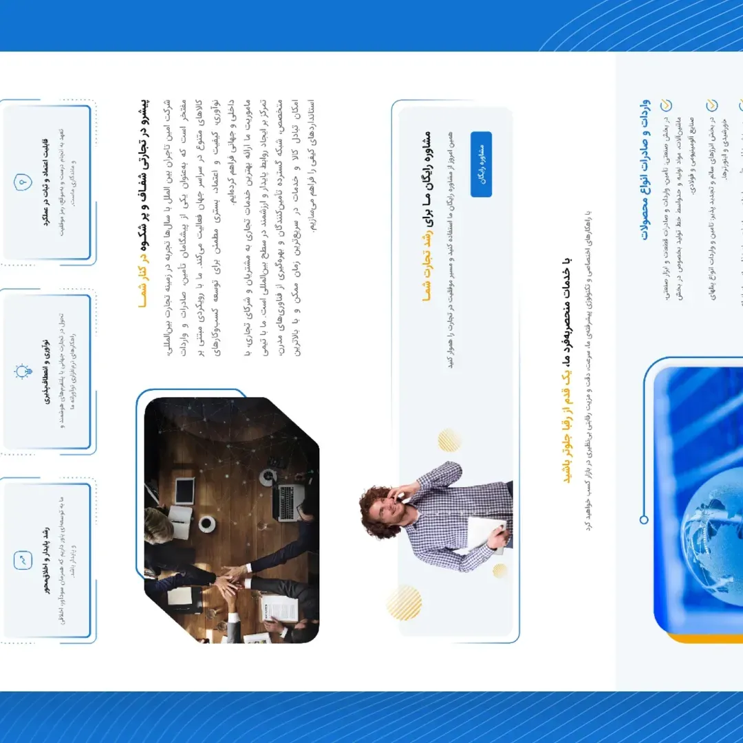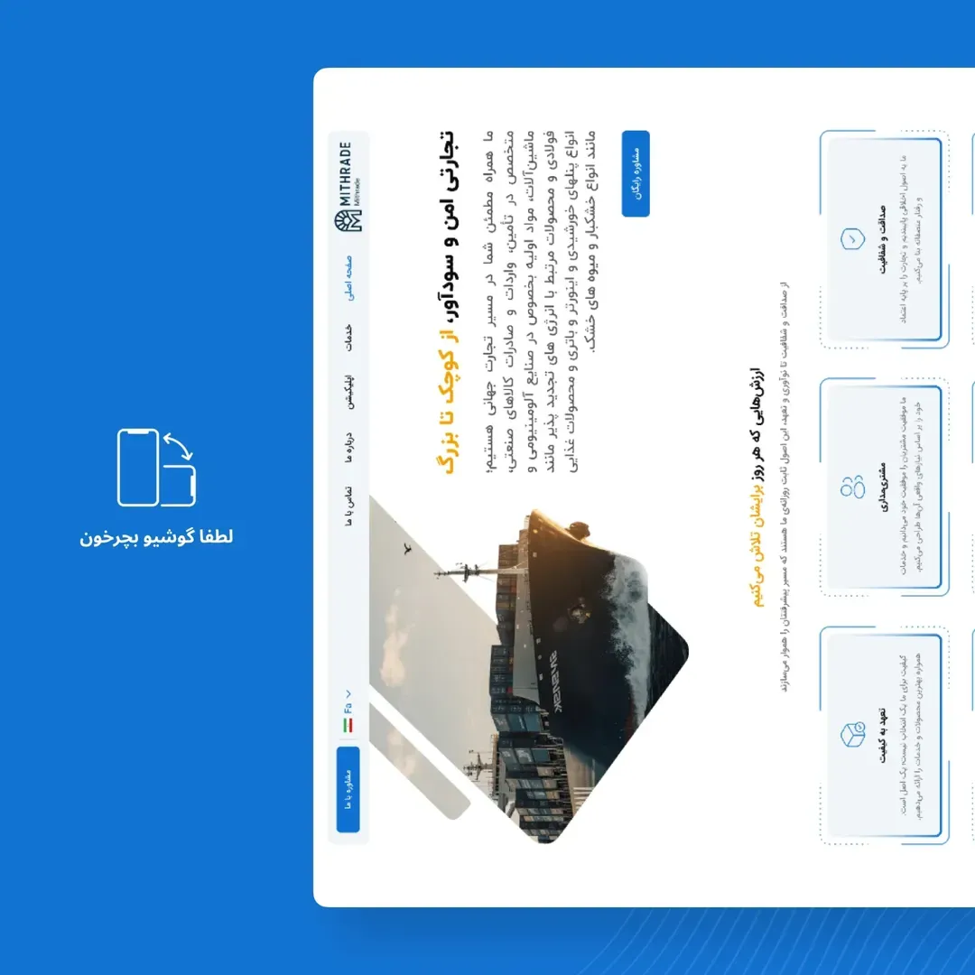 سایت شرکت امین تاجران بینالملل با هدف معرفی حرفهای خدمات بازرگانی و تسهیل ارتباط با بازارهای داخلی و خارجی طراحی شده است. این شرکت در حوزه تأمین، واردات و صادرات کالاهای صنعتی و ماشینآلات تخصصی فعالیت دارد و سایت بهگونهای طراحی شده که گستره خدمات را بهصورت شفاف و ساختارمند نمایش دهد.