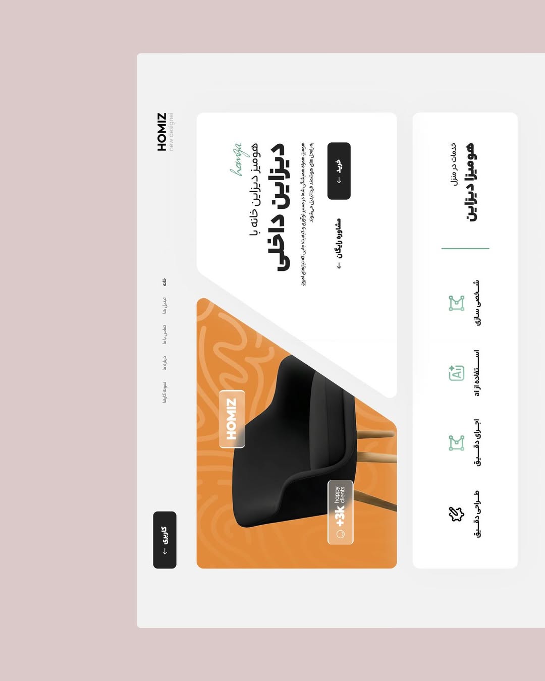 ترکیب خلاقیت، رنگبندی و المانهای بصری باعث شده سایت هومیز هم جذاب باشد و هم کاربردی، تا مشتریان بتوانند به راحتی با برند تعامل داشته باشند و تصمیمات آگاهانه بگیرند.
